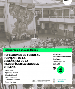 Posteriormente, se desarrollará una mesa de conversación centrada en el porvenir de la enseñanza de la filosofía en la escuela chilena. En esta instancia participarán la profesora, filósofa y escritora Dra. Olga Grau Duhart; el profesor de filosofía Sr. Orlando López Pérez; la profesora Srta. Valentina Pinto Tobar; junto a representantes estudiantiles de ambas universidades, Fernanda Saavedra y Jesús Morales.