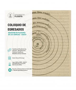 El Departamento de Filosofía de la Universidad de Santiago de Chile ha abierto la convocatoria al Primer Coloquio de Egresados del Magíster en Filosofía de las Ciencias, iniciativa que se realizará el próximo 29 de mayo en el edificio CEPEC, en la comuna de Las Condes.
